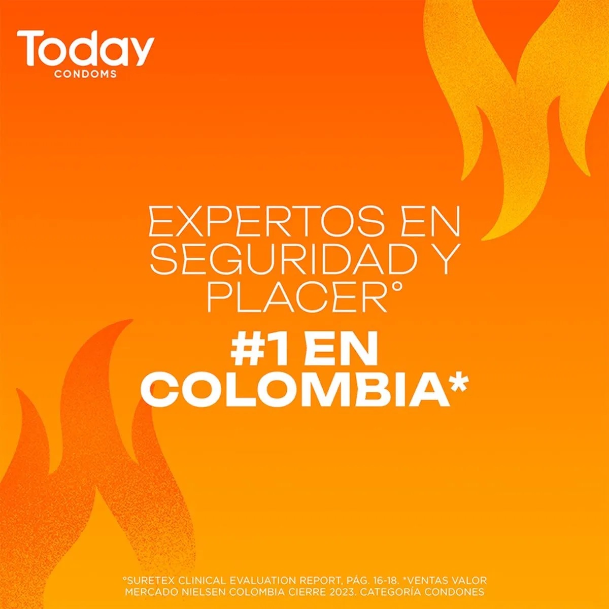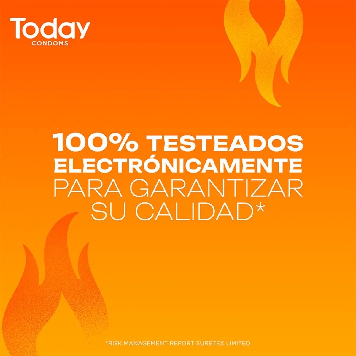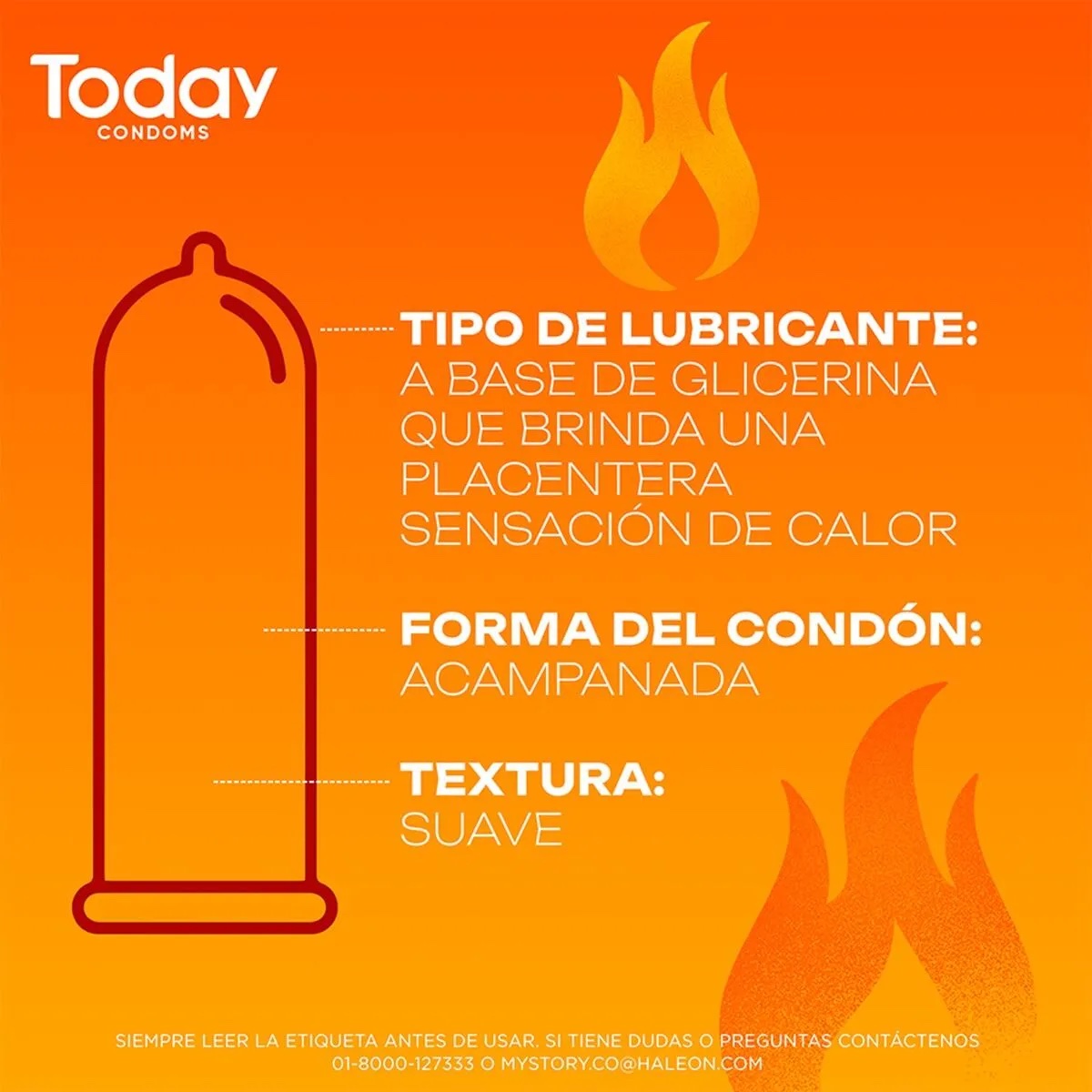 Today Condones Hot Sensation Sensación Calor, Posee un lubricante especial con el cual vivirás una placentera sensación de calor, para proveer más placer para ti y tu pareja. Máxima calidad comprobada, seguridad, sensibilidad y control de calidad electrónico X 3 UND